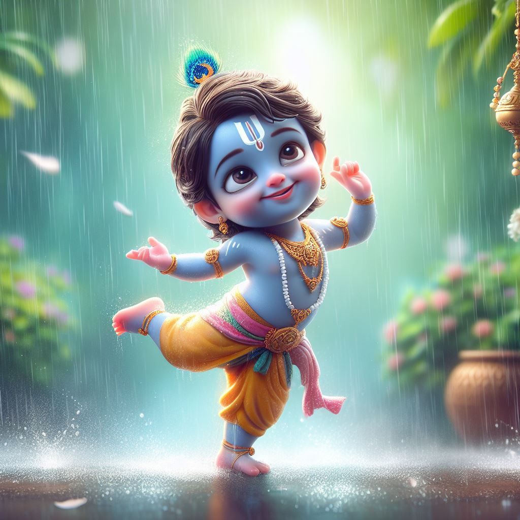 What a delightful sight! Little Kanha dances with pure joy in the monsoon showers, his playful *leela* brightening even the greyest of days. The glint in his eyes speaks of mischief and devotion, doesn\'t it? This image of Bal Krishna is a beautiful reminder to find happiness in every moment, and let go of your worries like raindrops. May this charming *darshan* bring a sprinkle of bliss to your phone and your life! 🌸✨💧