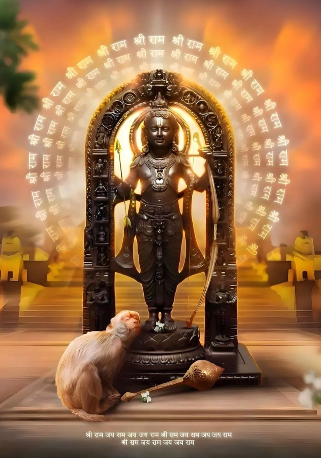 What a captivating darshan! Lord Ram stands in all His glory, radiating peace and strength. The devotion of Hanuman at His feet is truly inspiring, isn\'t it? The repetition of \'Shri Ram\' surrounding the deity creates a powerful atmosphere of bhakti. This image is a reminder of dharma and the unwavering love between Ram and His devotees. May this image bring a daily dose of divine energy into your life. 🙏✨💖