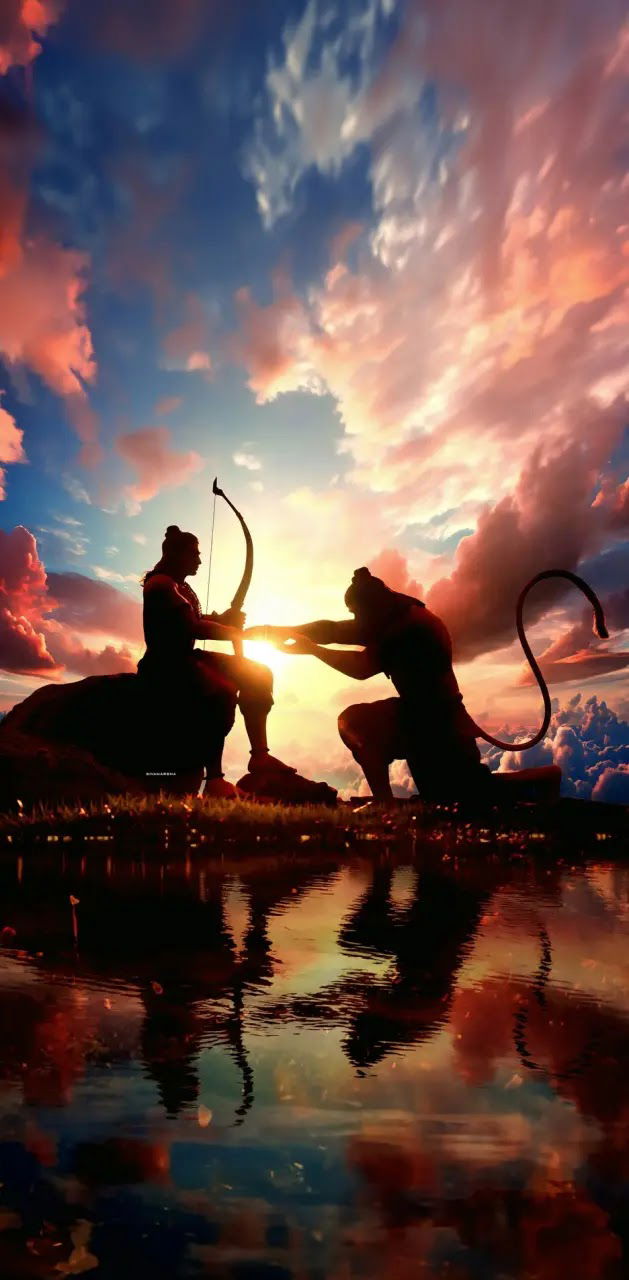 What a sight to behold! Hanuman, the mighty Pavanputra, is depicted here in unwavering devotion, poised to serve Lord Ram. The fiery sunset bathes the scene in a glow of bhakti, symbolizing the eternal bond between a devotee and his Prabhu. You can almost feel the strength and humility radiating from Bajrangbali as he stands ready to fulfill his master\'s will. Let this image fill your phone with divine energy and serve as a daily reminder of the power of selfless service and unwavering faith. 🙏🌅✨ Make your phone a window to daily darshan with this beautiful depiction of Ram and Hanuman!