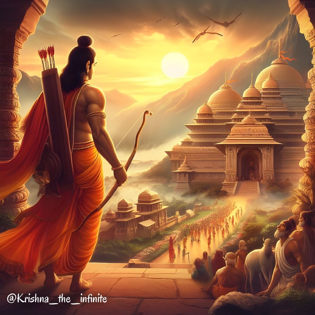 What stories does the golden sunset whisper to Raghavendra? This image captures a powerful moment of Shree Ram, bow in hand, overlooking a majestic city. The warm hues evoke a feeling of *bhakti* and the enduring strength of dharma. Feel the divine energy with every glance – this wallpaper is a chance to bring a little of Ram Rajya into your everyday life. May this inspire you on your own path! 🕉️✨🙏