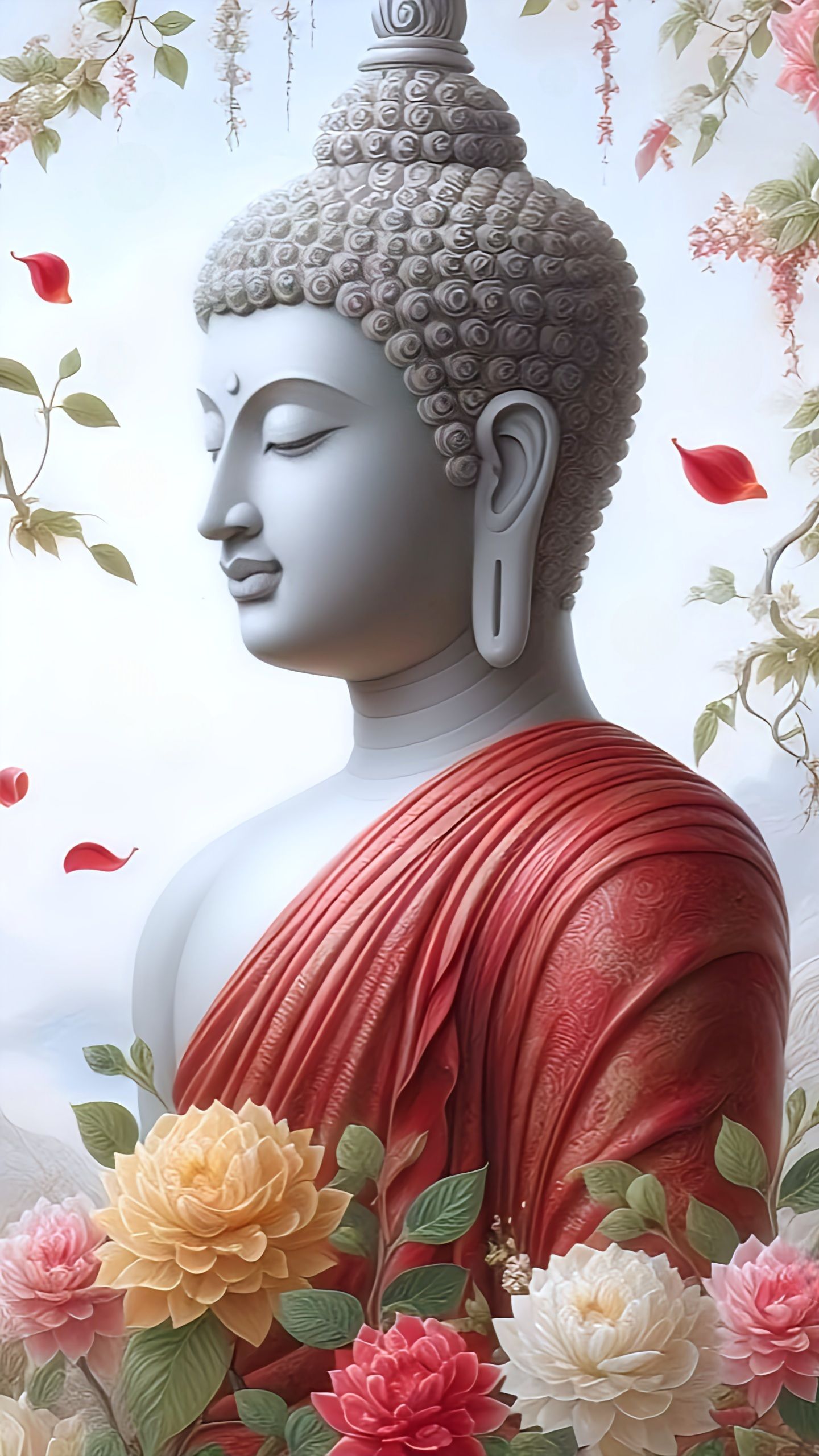 A sense of profound peace emanates from this beautiful depiction of the Tathagata. The gentle curve of Buddha\'s face, coupled with the vibrant red of his robes and the delicate blossoms surrounding him, creates a truly captivating image. May this *darshan* bring tranquility to your day, reminding you of the path to enlightenment. Let the teachings of the enlightened one guide you towards *moksha*. πΈπβ¨