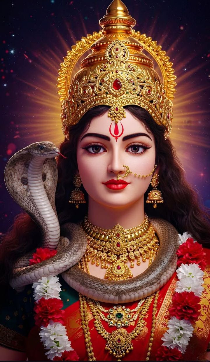 What stories does the gaze of Maa Parvati tell? This stunning depiction captures the divine beauty of Parvati Maa, adorned with a magnificent crown and embraced by the protective coils of a serpent. β¨ The exquisite jewelry and radiant aura remind us of her power and grace. This image serves as a daily reminder of *Shakti* and the boundless love of the Divine Mother. May her blessings fill your life with peace and strength. Make your phone a window to daily *darshan*! πΈπ