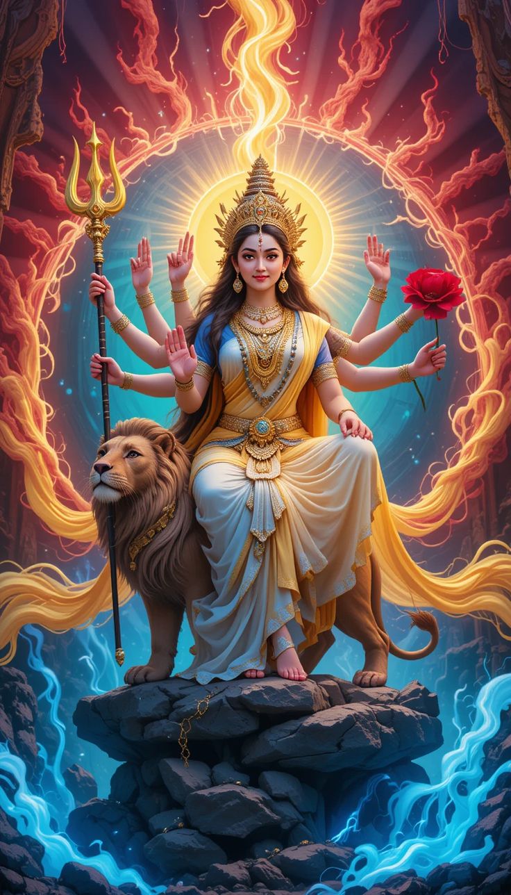 What stories does the radiant glow surrounding Durga Maa whisper to your soul? This stunning depiction of the Divine Mother, seated upon her majestic lion, embodies the very essence of *shakti*. The intricate details of her attire and the powerful symbolism of the trident remind us of her unwavering strength and protection. Allow the benevolent energy of Ambe Maa to fill your life with courage and grace. Make your phone a daily source of *darshan* and feel her blessings with every glance! 🕉️✨🙏