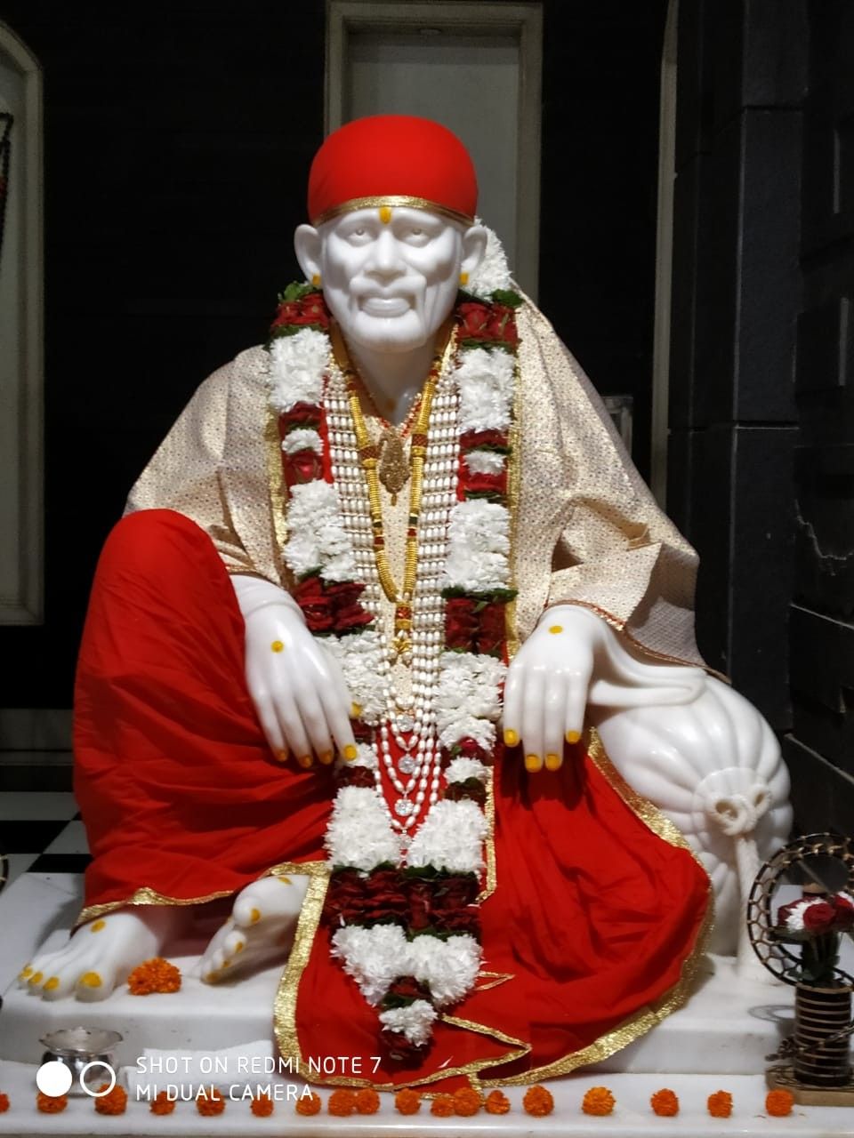 A gentle warmth radiates from this stunning marble statue of Shirdi Sai Baba. Adorned with a fresh garland of white flowers and draped in vibrant red cloth, Baba’s presence feels incredibly close. The intricate details of the statue, from the folds of his robe to the peaceful expression on his face, truly capture his divine essence. May this image bring a sense of *shanti* and *bhakti* into your life, allowing you to feel Baba\'s blessings with every *darshan*. 🙏🌸✨ Let the serenity of Sai Baba fill your days!