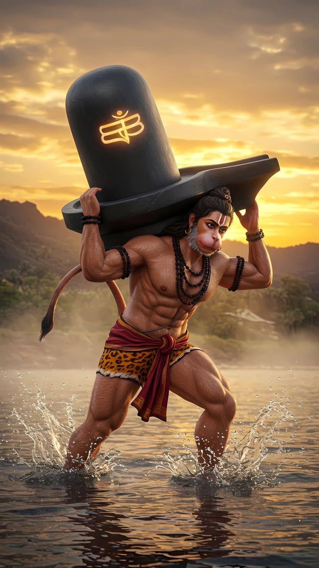 What a sight! Hanuman, the mighty Pavanputra, carries the sacred Shivalinga with unwavering devotion across the waters. The golden hues of the setting sun illuminate this incredible display of bhakti and strength. You can almost feel the power radiating from Bajrangbali as he performs this seva. 🙏 This image is a constant reminder of the devotion and selfless service that resides within us all. Let your phone be a window to daily darshan! 🕉️✨