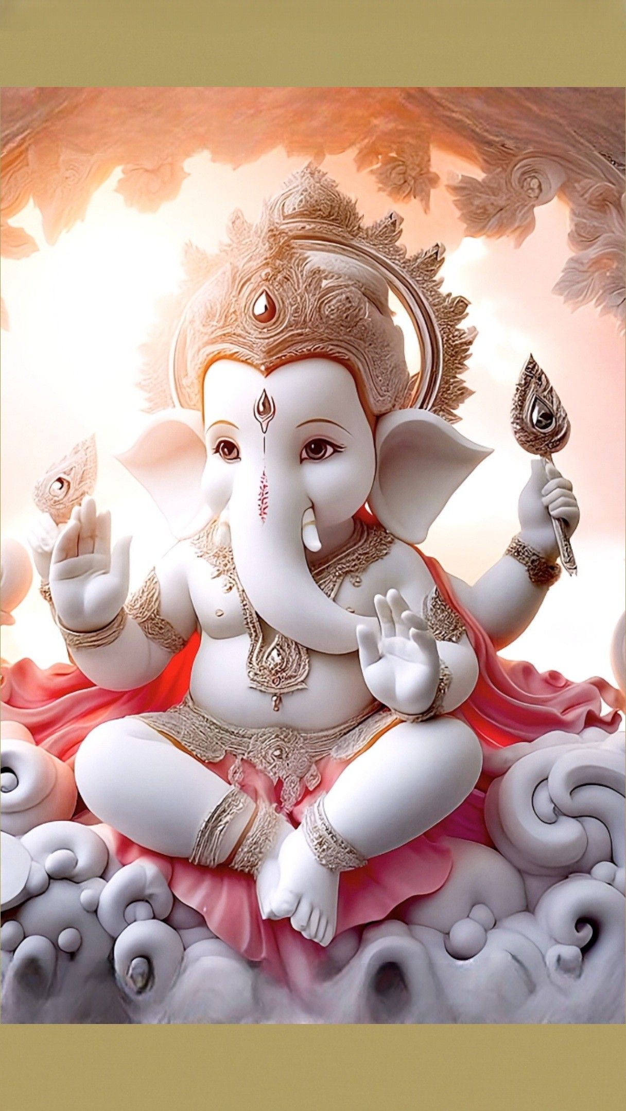 What stories does the gentle warmth in Ganpati Bappa\'s eyes tell? ✨ This beautiful depiction of Shree Ganesha radiates a powerful sense of *shakti* and auspicious beginnings. The intricate details of his *mukut* and the sweet *modak* in his hand remind us of his blessings for a life full of happiness and prosperity. May this image bring you daily *darshan* and fill your heart with *bhakti*. 🙏💖🐘