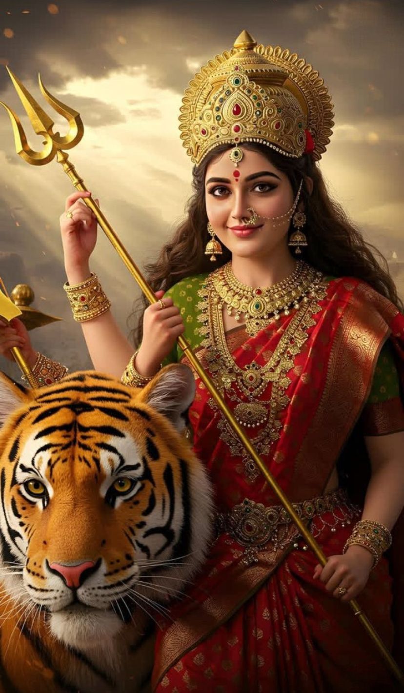 A sense of profound *shakti* radiates from this breathtaking portrait of Maa Durga. Her gaze, filled with grace and power, embodies the divine feminine energy that protects and nurtures us all. Adorned in exquisite gold jewelry and a vibrant red sari, she sits majestically upon her vahana, the noble tiger, her trident held high as a symbol of strength and righteousness. May this image bring *darshan* and blessings into your life, reminding you of the divine mother’s unwavering presence. ✨🙏💖