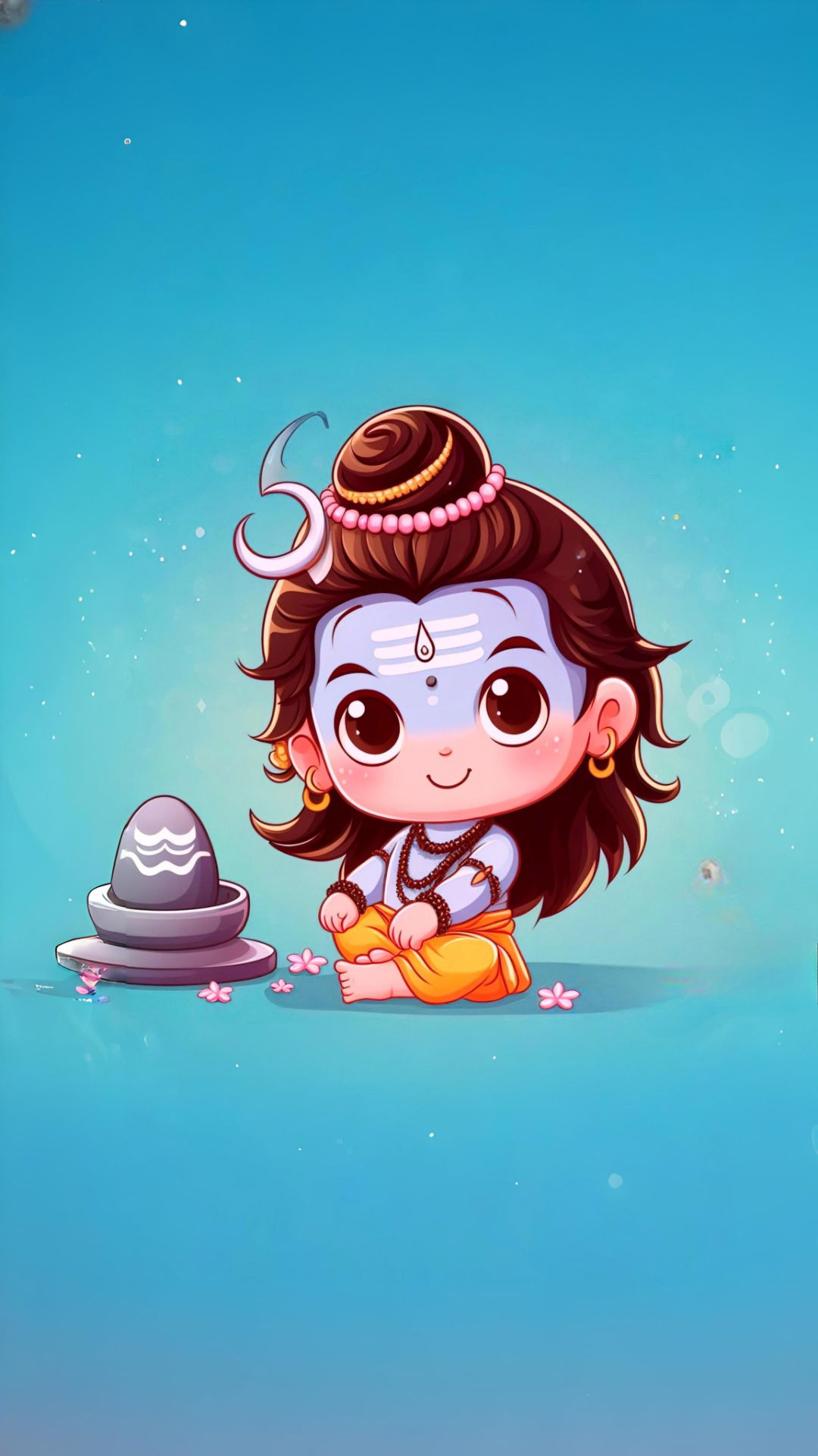 What a delightful sight! Baby Mahadev sits peacefully, his damru resting nearby, radiating a sense of calm and divine presence. The soft turquoise background and the delicate flower petals add to the image\'s enchanting vibe. It\'s like a glimpse into the playful *leela* of the cosmic dancer. May this image bring a moment of *shanti* and devotion to your day and fill your phone with blessings. ππΈβ¨