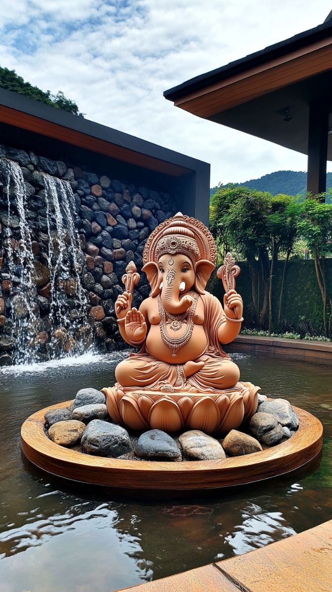 What a serene sight! Lord Ganesha sits peacefully amidst a cascading waterfall and a beautifully landscaped garden. The gentle flow of water symbolizes purity, while the lush greenery evokes a sense of harmony and *shakti*. This exquisite *murti* of Ekdantaya radiates blessings and wisdom. May this image bring a touch of divine grace to your day and make your phone a source of daily *darshan*! 🕉️🙏✨