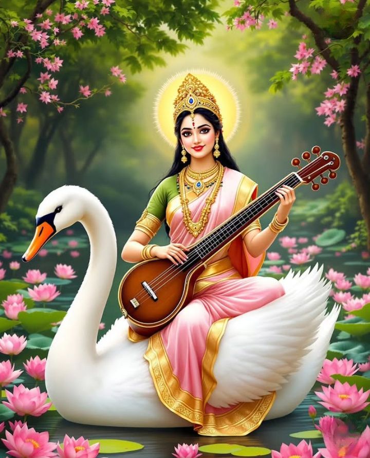 Can you imagine the melodies flowing from Saraswati Maa’s veena? This beautiful image shows the Devi of knowledge and music, seated serenely on her majestic swan amidst a vibrant garden of lotuses. Her divine presence brings a sense of peace and learning. It’s said that listening to her music opens the doors to wisdom and creativity. May this *darshan* inspire you on your own path to enlightenment!🌸🦢✨